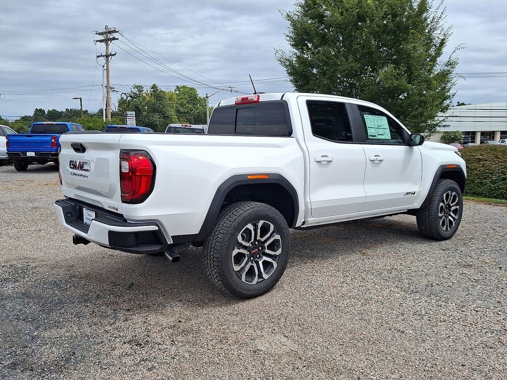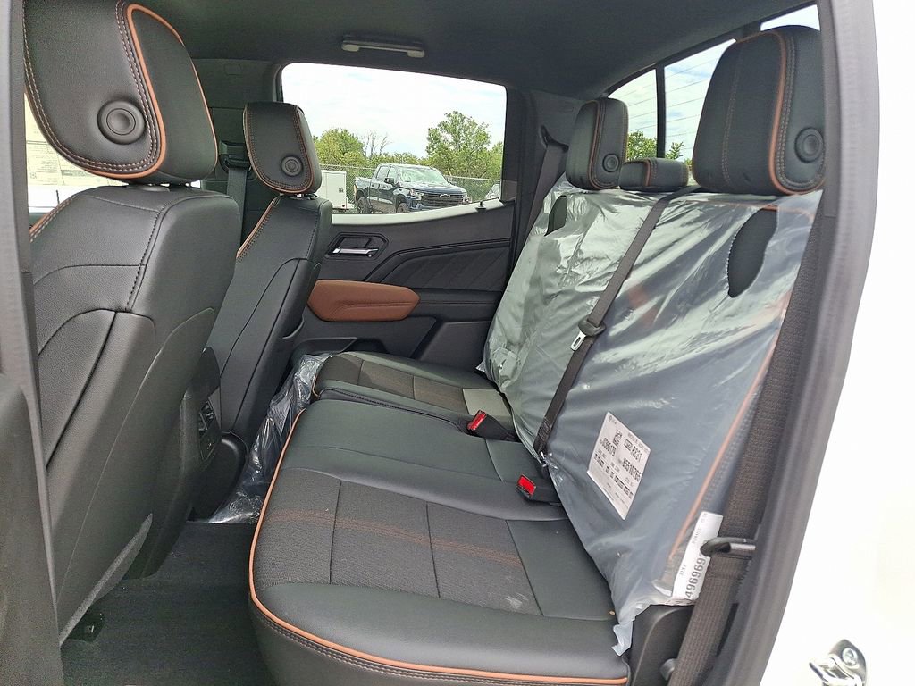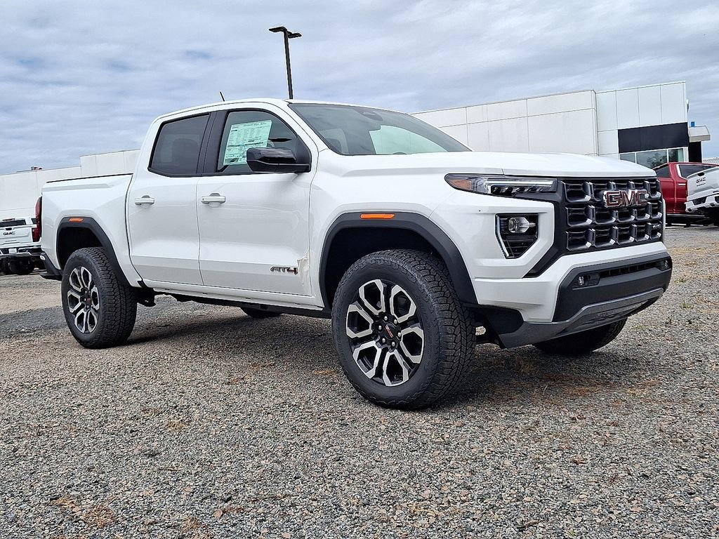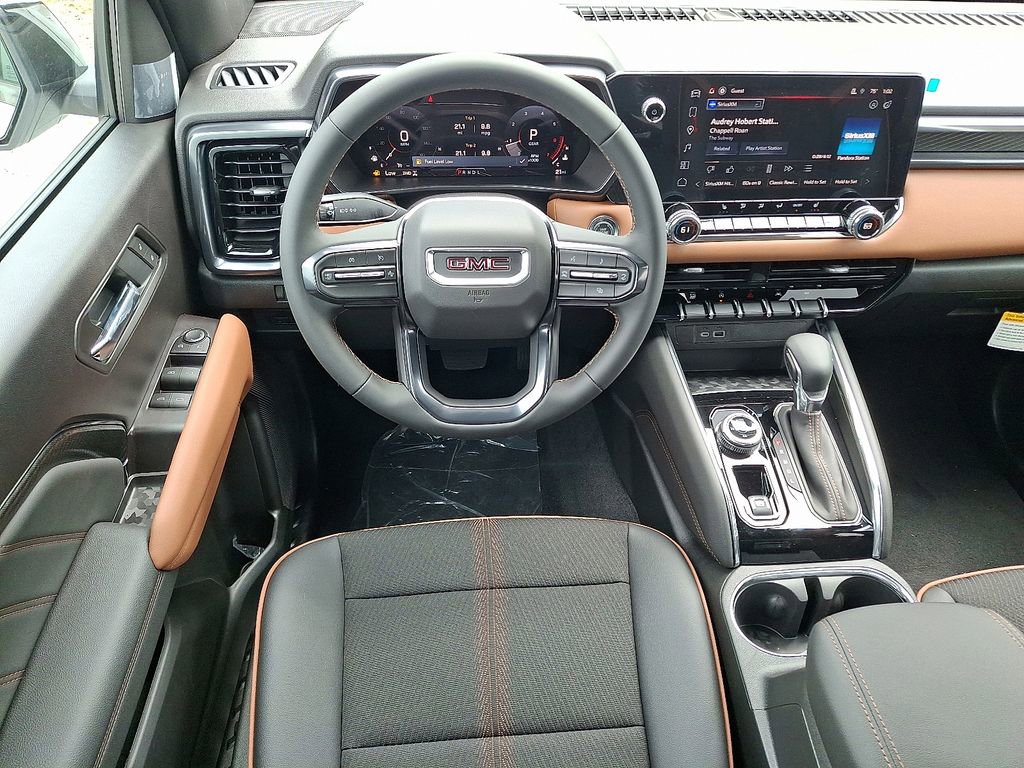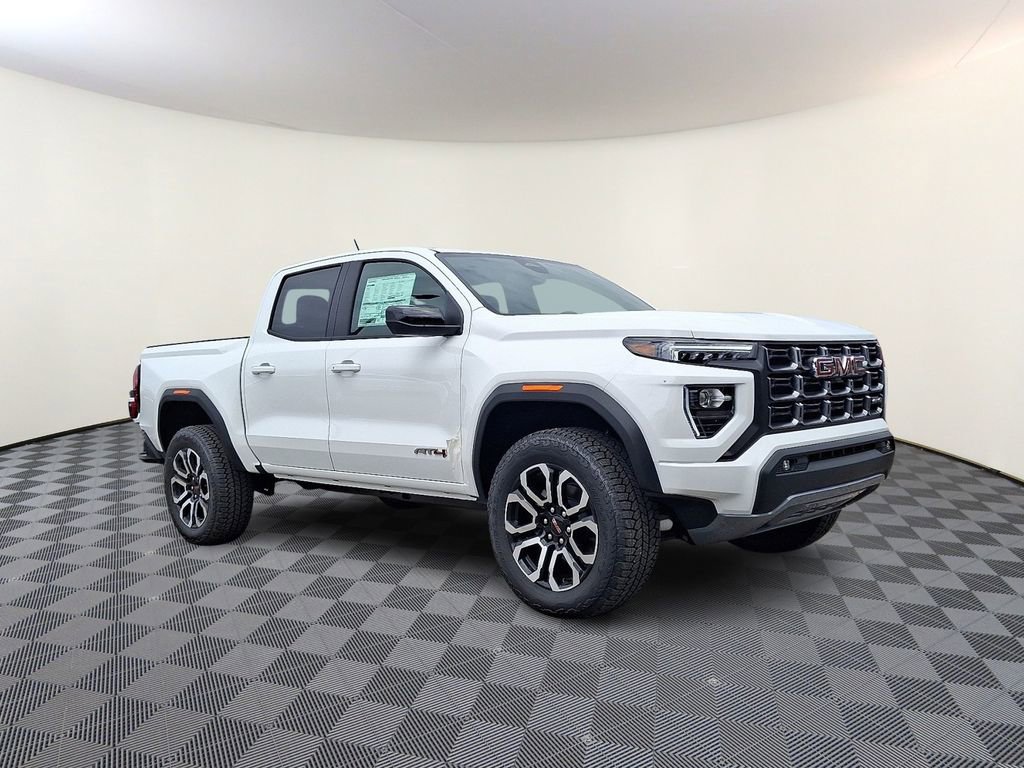 Summit White 2025 GMC Canyon AT4 4WD 8-Speed Automatic 2.7L I4 Turbocharged DOHC 16V LEV3-SULEV30 310hp 4WD, 120-Volt Bed Mounted Power Outlet, 2 1st Row USB Charge/Data Ports, 2 Rear USB Ports in Center Console (Charge-Only), 3.42 Rear Axle Ratio, 4-Way Manual Front Passenger Seat Adjuster, 4-Wheel Disc Brakes, 6 Speakers, 6-Speaker Audio System Feature, 8-Way Power Driver Seat Adjuster, ABS brakes, Air Conditioning, Alloy wheels, AM/FM radio, Apple CarPlay/Android Auto, Auto High-beam Headlights, Auto-dimming Rear-View mirror, Automatic Emergency Braking, Automatic Stop/Start, Automatic temperature control, Bed-Mounted Tubular Sport Bar (LPO), Black Badges (LPO), Blind Zone Steering Assist w/Trailering, Brake assist, Bumpers: body-color, Canyon Pro Safety, Canyon Safety Plus Package, Cloth/CoreTec Seat Trim, Compass, Delay-off headlights, Driver & Front Passenger Illuminated Visors, Driver door bin, Driver Mode Selector, Driver vanity mirror, Dual front impact airbags, Dual front side impact airbags, Dual-Zone Auto Climate Control Air Conditioning, Electronic Stability Control, Emergency communication system: OnStar, EZ-Lift & Lower Tailgate, Following Distance Indicator, Forward Collision Alert, Front anti-roll bar, Front Bucket Seats, Front Center Armrest, Front dual zone A/C, Front fog lights, Front LED Fog Lamps, Front License Plate Kit, Front Passenger Seatback Map Pocket, Front Pedestrian & Bicyclist Braking, Front reading lights, Front wheel independent suspension, Heated door mirrors, Heated Driver & Front Passenger Seats, Heated front seats, Illuminated entry, Inside Rear-View Auto-Dimming Mirror, Integrated Trailer Brake Controller, IntelliBeam Automatic High Beam On/Off, Interior Overhead Courtesy Light w/Dual Reading Lamp, Lane Keep Assist w/Lane Departure Warning, Low tire pressure warning, MultiStow Tailgate Storage Compartment, Navigation System, Nightfall Edition, Occupant sensing airbag, Off-Road Suspension, Outside temperature display, Overhead airbag, Overhead console, Panic alarm, Passenger door bin, Passenger vanity mirror, Power door mirrors, Power Driver Lumbar Control Seat Adjuster, Power driver seat, Power steering, Power windows, Preferred Equipment Group 4SG, Radio data system, Radio: 11.3 Diagonal Premium GMC Infotainment Sys, Rear Cross Traffic Braking, Rear of Console 120-Volt Power Outlet, Rear reading lights, Rear step bumper, Rear window defroster, Remote keyless entry, Remote Vehicle Starter System, Rocker Panel Protector (LPO), Security system, SiriusXM w/360L, Speed control, Speed-sensing steering, Split folding rear seat, Steering wheel mounted audio controls, Stop/Start System Disable Button Engine Control, Tachometer, Tailgate Keyed Cylinder Lock, Telescoping steering wheel, Tilt & Telescopic Manual Steering Column, Tilt steering wheel, Traction control, Trip computer, Ultrasonic Rear Park Assist, Variably intermittent wipers, Wheels: 18 x 8.5 Dark Gray Machined Finish Alum, Wheels: 20 x 9 Machined Faced Aluminum, Wireless Apple CarPlay/Wireless Android Auto, 4WD.